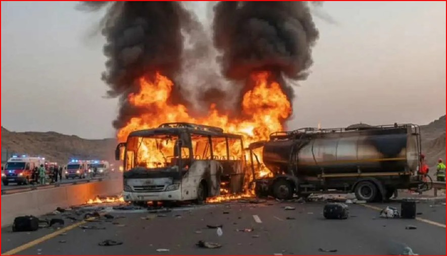 सऊदी अरब में बीती रात एक भयानक सड़क हादसे में कम से कम 42 भारतीय हज यात्रियों की दर्दनाक मौत हो गई। मक्का से मदीना जाते समय हज यात्रियों से भरी एक बस तेल से भरे टैंकर से जा टकराई, जिसके बाद बस तुरंत आग के गोले में तब्दील हो गई। माना जा रहा है कि टैंकर में डीज़ल भरा हुआ था, जिससे आग तेज़ी से फैली और यात्रियों को संभलने का मौका भी नहीं मिला। हादसे के वक्त बस में सवार सभी यात्री गहरी नींद में थे।
