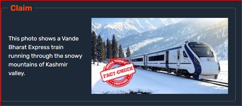 बर्फ से ढके पहाड़ों और ऊंचे पेड़ों के बीच एक सफेद और नीले रंग की ट्रेन की फोटो सोशल मीडिया पर वायरल हो रही है। इसे शेयर करने वालों ने दावा किया कि यह मनमोहक नजारा कश्मीर घाटी का है और यह ट्रेन वंदे भारत है। फेसबुक पर फोटो शेयर करते हुए एक व्यक्ति ने लिखा, "यह फोटो स्विट्जरलैंड की नहीं है। यह हमारे खूबसूरत भारत की है। कश्मीर की बर्फ से ढकी घाटियों से गुजरती वंदे भारत ट्रेन का नजारा वाकई मनमोहक है"। फैक्ट चेक ने पाया कि यह फोटो असली नहीं है और संभवतः ट्विटर के ग्रोक AI चैटबॉट का इस्तेमाल करके बनाई गई है। हालांकि, वंदे भारत एक्सप्रेस जल्द ही कश्मीर में लॉन्च की जाएगी।